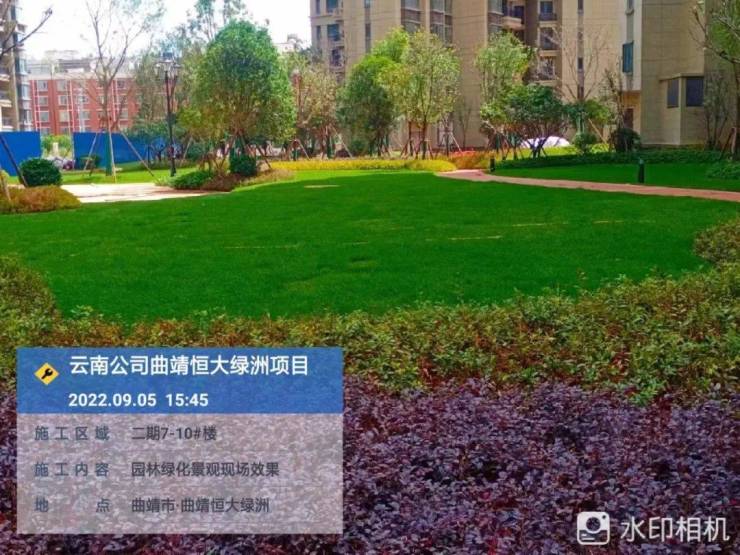 2-6#楼园区水电穿线完成约5000米,完成剩余工程量的100%;2-6#楼园区给排水管网敷设完成,照明系统线管和电缆安装完成,庭院灯安装完成,草坪灯安装完成;2-6#楼园区路面铺贴全部完成;园区景观石布设完成;园区景墙石材安装全部完成;园路基础全部浇筑完成;人工湖周边栏杆安装全部完成;园区井盖安装完成;园路破损修补完成;园林绿化整体楼栋周边绿化已基本完成,地被种植总体完成约7500㎡,种植大树100棵。