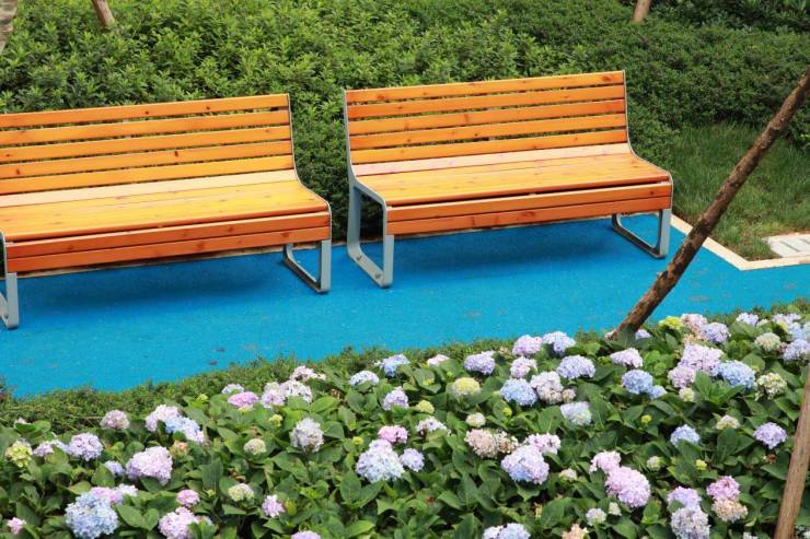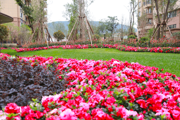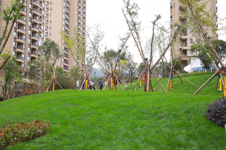 园林后半部分地势相对平坦,园区主轴线上多以景观绿植为主,包括迎宾树阵、阳光草坪等,同时使用绣球等彩色植被增加色彩的丰富度点缀过渡。而且值得一提的是,园区内的绿植均是通过提前种植,才能达到如今郁郁葱葱、枝繁叶茂的状态,一点都不像是刚交房的项目。