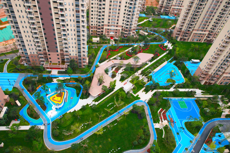 可以想象,在风和日丽的午后,孩子在家长的陪同下,可以在游乐场、儿童活动区中打闹嬉戏,而业主可以在中心庭院看台上一览前半部区的美景,老年人在中心庭院之中下棋、闲聊,青少年们则在运动场上肆意挥洒汗水,搭配周边景观,业主既在生活,自身也是一道风光。