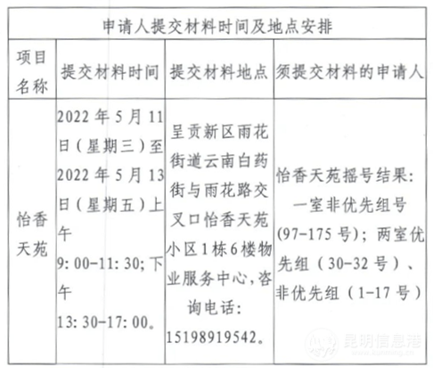 公告明确,参与补选的申请人须在5月11日-5月13日,到昆明市呈贡新区雨花街道云南白药街与雨花路交叉口怡香天苑小区1栋6楼物业服务中心提交材料。相关材料按照昆明安居网首页“在线帮助”公布的《申请公共租赁住房提交材料清单》准备。