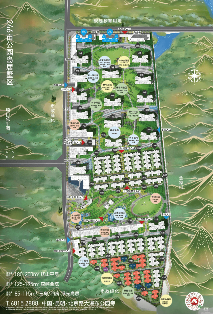 向山的岛项目,整体占地246亩,建筑面积57万方,绿地率超40%,容积率仅2.5,项目定位为全岛链墅区、城市智慧生态岛居作品!作为片区容积率较低的项目,以超未来的设计理念,以生态水系分割,以智慧物业管家系统运营,是金科入昆以来,在江湖海之后昆明重点打造的“博翠”产品系,将开辟昆明北市区新一代的高端住宅名片,实现“山上岛居”的未来生活社区。项目内造业主私享牧野公园、7大生活情景花园和3条自然景观林带,拥有昆明较大的社区中央公园,让森居贯穿始终;外享10大市政公园,产品包含高层、大平层、合院及住宅底商,面积约87-200㎡,以实现二人世界到三代同堂的品质改善居住需求,常住、旅居皆宜,是北市高区不可多得的高端人居典范。