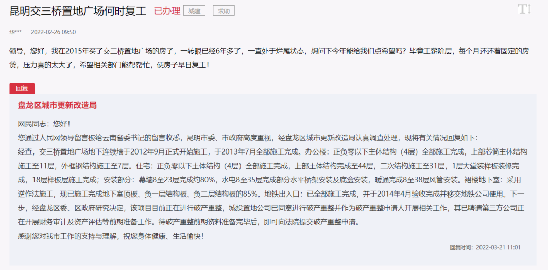 2月26日,网友咨询:交三桥置地广场何时复工?3月21日,盘龙区城市更新改造局回复:经查,交三桥置地广场地下连续墙于2012年9月正式开始施工,于2013年7月全部施工完成。