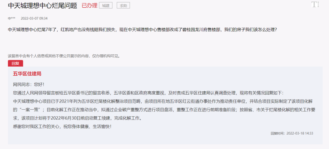 3月18日,五华区住建局回复:中天城理想中心项目已于2021年列为五华区烂尾楼化解整治项目范畴,由项目所在地五华区红云街道办事处作为推动责任单位,并结合项目实际制定了该项目化解的“一案一策”。