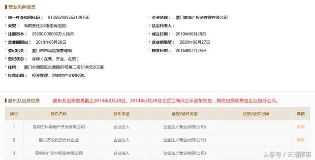 工商注册资料显示,拿地的昆明万睿地产为官渡区文化生态新城一级开发社会投资人昆明市鑫海汇投资发展有限公司的全资子公司。昆明市鑫海汇投资发展有限公司的母公司为厦门鑫海汇投资管理有限公司,而昆明万科房地产开发有限公持有厦门鑫海汇投资管理有限公司40%的股权。