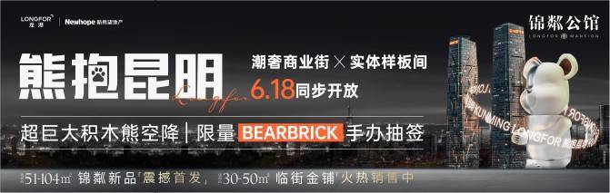 价值万元的限定款1000%积木熊手办,全城“零门槛”抽签!6月1日起,扫码关注“龙湖U享家”,邀请20位好友助力,即可获得现场抽签资格。6月17日18:00,报名登记将截止。6月18日10:00起,将进行抽签资格核销,发放第二轮现场抽签资格(更多活动参与规则,请关注云南龙湖公众号或来电咨询;锦粼公馆对于活动内容拥有修改以及最终解释权。)
