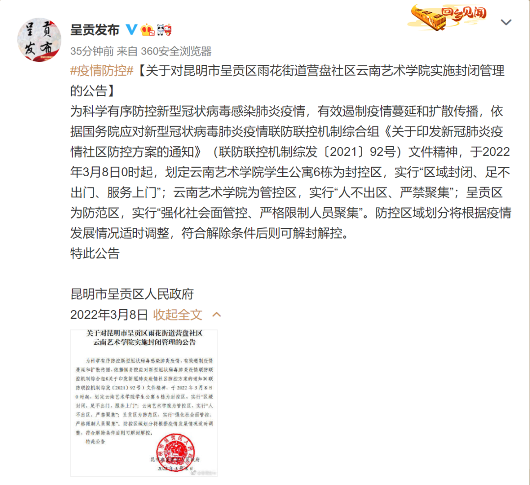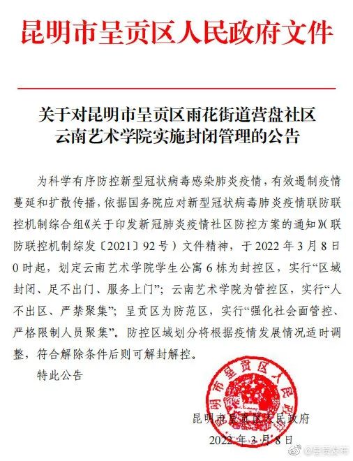 3月8日,呈贡区人民政府发布关于对昆明市呈贡区雨花街道营盘社区云南艺术学院实施封闭管理的公告。