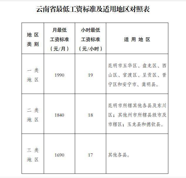此次调整仍按照县级行政区域的经济社会发展水平保持三类标准,其中昆明市五华区、盘龙区、西山区、官渡区、呈贡区、晋宁区和安宁市、嵩明县为一类地区,月最低工资标准从1900元提高到1990元,小时最低工资标准从18元提高到19元;昆明市所辖其他各县及东川区、其他州市所辖县级市及市辖区、玉龙县和德钦县为二类地区,月最低工资标准从1750元提高到1840元,小时最低工资标准从17元提高到18元;其他各县为三类地区,月最低工资标准从1600元提高到1690元,小时最低工资标准从16元提高到17元。