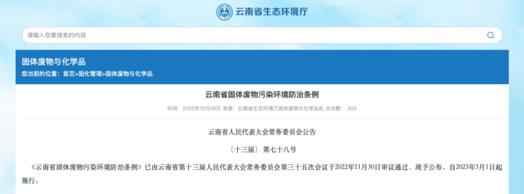 日前,云南省人民代表大会常务委员会公布了自2023年3月1日起施行的《云南省固体废物污染环境防治条例》(以下简称《条例》)