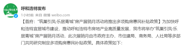 9月26日,呼和浩特市人民政府办公室官方微博发布消息称,呼和浩特将举办“筑巢引凤·乐居青城”房产展销月活动,研究制定了多项购房惠民补贴政策。