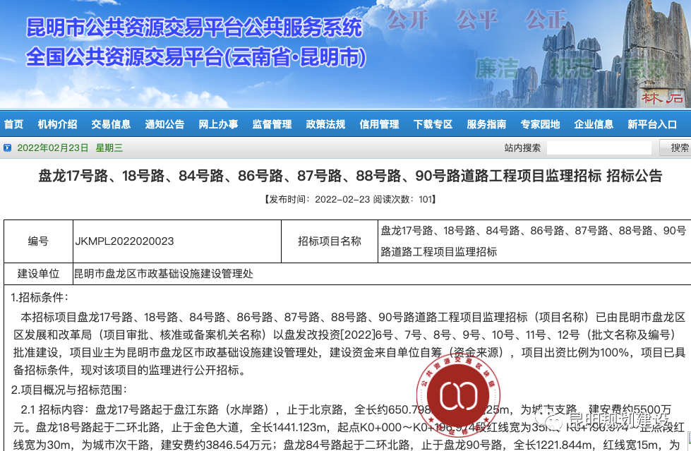 2月23日,昆明市公共资源交易中心发布《盘龙17号路、18号路、84号路、86号路、87号路、88号路、90号路道路工程项目监理招标招标公告》,公告显示,盘龙区将投资16231.46万元新建以上几条道路,计划于3月20日开工,于2024年3月20日竣工。