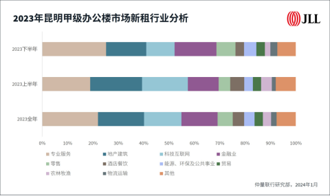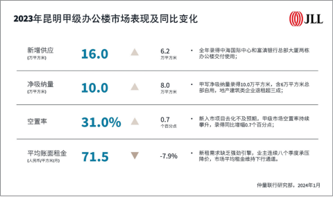 2024年1月23日,昆明——2023年,全市经济总体平稳,结构性矛盾仍在。甲级办公楼市场,全年各行业总退租量中,地产建筑退租占比超三成,市场空置率仍处高点,去化承压,租金跌幅扩大。优质零售物业市场,云贵地区首座万象城开业,存量项目积极打造差异化提升核心竞争力。