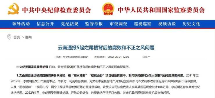“文山州交通运输局四级调研员李成明,在‘丽水湖畔’‘樱花山谷’项目征地拆迁中,利用职务便利为他人谋取利益收受贿赂问题”“建水县古城保护发展服务中心党组书记李永生等,在‘尼乡湾’‘广慈湖壹号’等项目中违规审批、监管不力问题”……近日,云南省纪委监委连续通报曝光了4批20起烂尾楼背后的腐败和不正之风典型问题。