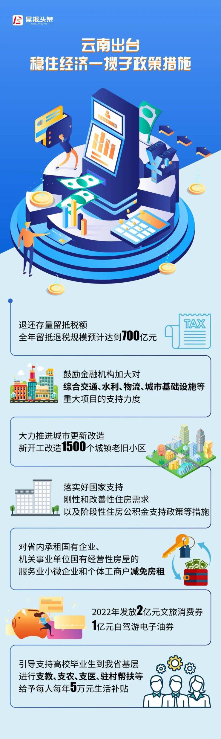 云南将实施好延期还本付息政策,努力做到应延尽延,本轮延期还本付息日期原则上不超过2022年底;对借用支农再贷款加大乡村振兴领域信贷投放的农村合作金融机构,按再贷款金额的1%给予财政贴息;鼓励金融机构加大对综合交通、水利、物流、城市基础设施等重大项目的支持力度。