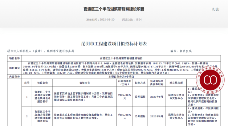 8月30日,昆明市公共资源交易平台发布“官渡区三个半岛湖滨带复耕建设项目”招标计划表。根据计划表,官渡区三个半岛湖滨带复耕建设项目就地恢复73个图斑共计216.16亩。