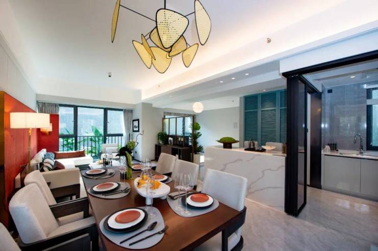此外,样板间还将原本封闭的厨房墙面进行割舍,打造出开放式的中厨、西厨,将厨房、餐厅区域和客厅区域融为一体,空间感十足。这样的改造,对于希望拥有超大会客空间的年轻精英群体来说再好不过。