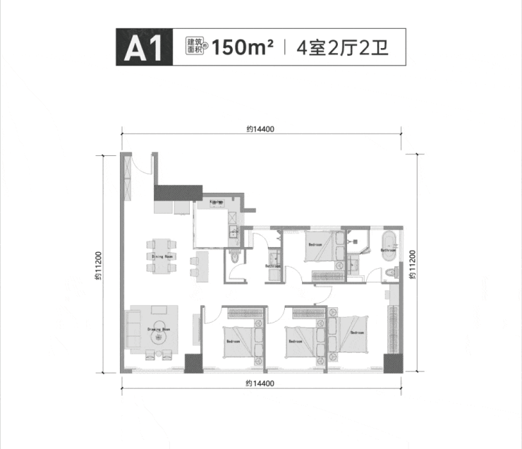 再以建面约150㎡的A1户型为例,原本户型图的格局为四房两厅设计,但售楼部的样板间其实也是进行了改造的。