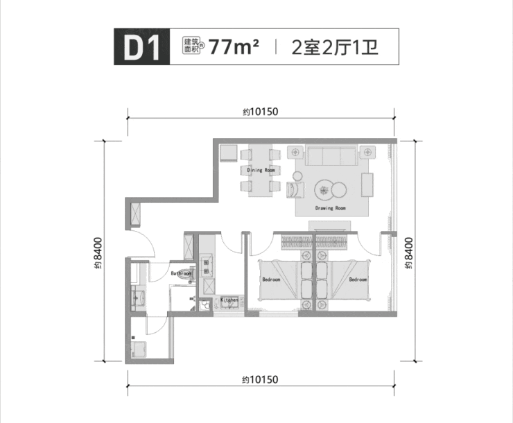 项目为首置业、年轻客群专门设计了低门槛户型:建面约77㎡的精装两房。