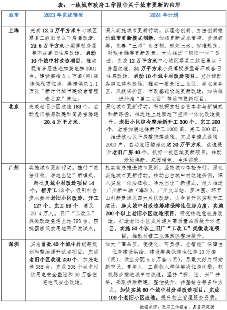 近期,各地政府工作报告均已公开,以四个一线城市为例,北京、上海、广州、深圳均在报告中明确了2024年城市更新的实施计划,总体呈现出城中村、老旧小区和老旧厂房改造力度更大、城中村改造与筹建保障性住房相结合、鼓励城市更新模式创新等。