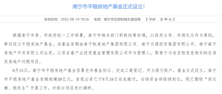 8月19日,南宁市住房和城乡建设局宣布,已设立以政府主导、市场化运作为原则的平稳房地产基金。据悉,该基金首期由南宁轨道地产集团、南宁交通投资集团、南宁威宁房地产公司、江苏言睿产业投资基金作为管理人,基金首期规模30亿元,聚焦于住房类房地产问题项目。