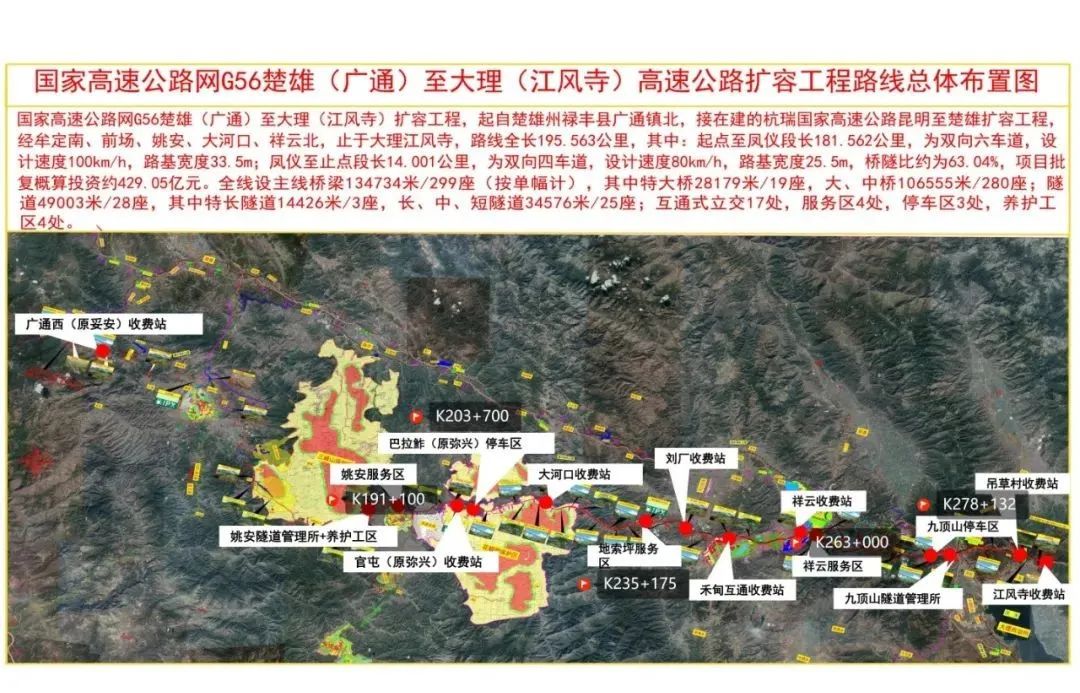 楚雄(广通)至大理高速公路(简称“新楚大高速”)起于楚雄州禄丰县广通镇以北,接新昆楚高速公路,途经禄丰县、牟定县、姚安县、祥云县、大理市5个县市,止于大理市江风寺,接原楚大高速公路,项目路线全长200.5公里,批复概算总投资为429.05亿元,由云南省交通投资建设集团有限公司为牵头人的17家单位组成的联合体按PPP建设模式负责实施。项目起点至凤仪段181.56公里采用双向六车道高速公路标准建设,路基宽33.5米;凤仪至止点段14.00公里,广通连接线4.93公里,采用双向四车道高速公路标准建设,路基宽25.5米。项目全线设置17处互通式立交,4处服务区,3处停车区;项目桥隧比为62.6%,批复建设工期为4年。
