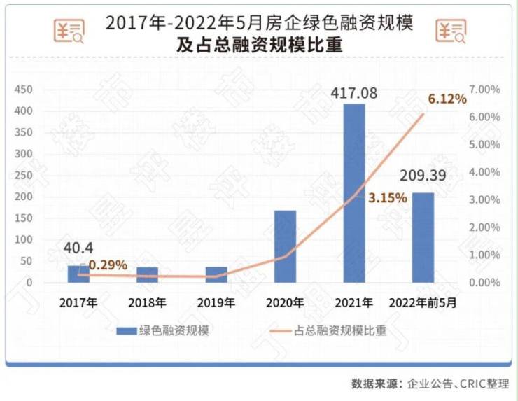 从绿色融资来看,近期其在房企融资中比较高频。据克而瑞研究统计,2022年前5个月,房企的绿色融资规模达到209亿元,是2021年全年绿色融资规模的一半,同时总融资规模占比也提升到了6.12%。
