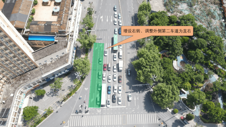 环城东路南口压缩了非机动车进口道宽度,增设了一条独立右转车道,同时外侧第二车道调整为直右车道,距交叉口停止线十五米处,调整为虚实线,便于右转车辆变道。