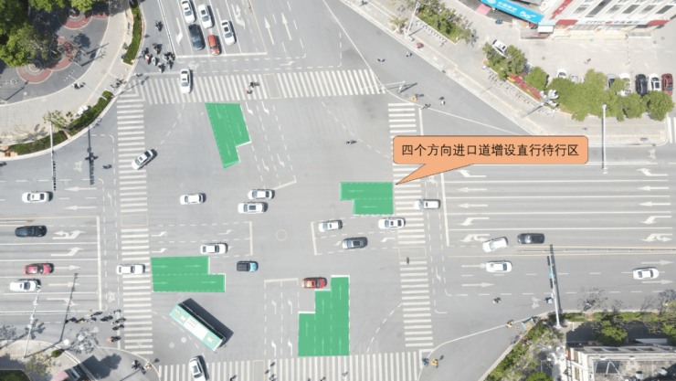 四个方向进口道增设直行待行区,减少车辆排队长度,提高交叉口通行效率。