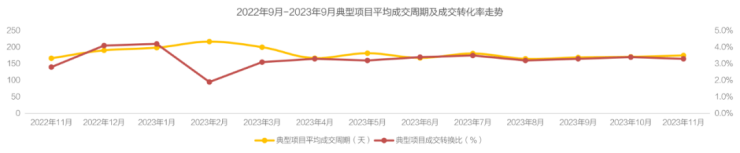 克而瑞典型项目监测数据显示,今年8月以来,带看量持续上升,但客户房源选择性多,成交转化率低位,去化周期长。转化率长期维持3%左右低位水平,11月转化率3.3%,环比下降0.1个百分点。