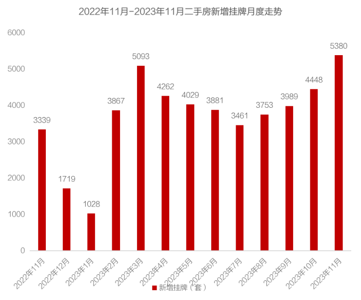 11月,昆明二手房挂牌量大幅上涨,环比涨幅达21%,同比上涨61%,共计5380套。