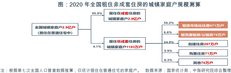 基于以上比例关系,按全国城镇家庭户2.9亿户(居住在普通住宅中)计算,共约671万户城镇家庭租住在非成套的市场化住房中。这部分家庭住房条件较差,存在较大的改善性租房潜力。