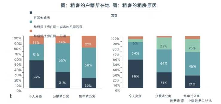 集中式公寓租客以本地人为主。80.1%的集中式公寓租客的户口在本地,较个人房源明显高出33.2个百分点。其中,57.8%的集中式公寓租客为跨区县租房(户口所在地和租赁住房在同一城市的不同区县)。