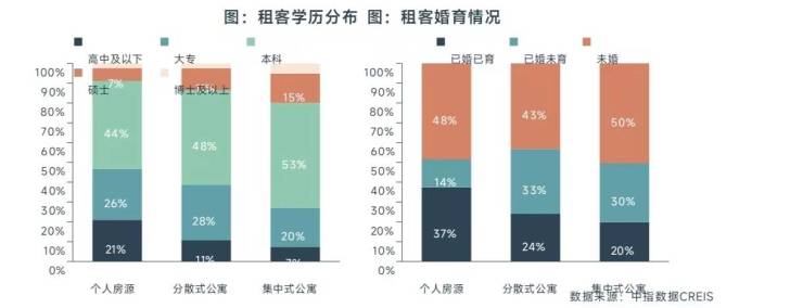 集中式公寓租客学历更高。73%的集中式公寓租客为本科及以上学历,较个人房源高出19.6个百分点。