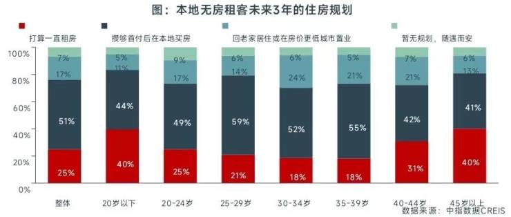 中指调查结果显示,关于本地无房租客未来3年的住房规划,51%的受访租客选择在本地置业,17%的受访租客选择回老家居住或在房价更低的城市购房,仅25%的受访租客计划未来长期租房,表明租房目前仍只是居民购房前的过渡选择,居民的住房观念仍偏好购房。通过与年龄结构进一步交叉分析发现,年轻人租房意愿相对更强,一方面是受其人生阶段和财富积累所影响,另一方面也反映出年轻人的住房观念正在发生改变。