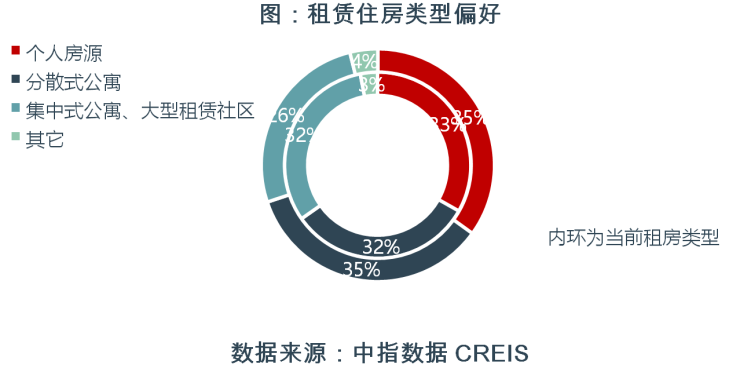 集中式公寓租客多数有通勤或改善需求。76%的集中式公寓租客在本地有房,但因为通勤、改善等原因选择了租房,其中45%的租客因为自有住房离公司太远,选择在公司附近租房;25%的租客因为自有住房太老旧,选择租住较新的住房。