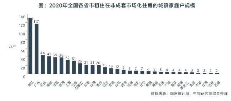 浙江省、广东省租住非成套住房的家庭户规模较大,租房改善潜在需求旺盛。按照上述方法推算,分省市来看,浙江省、广东省租住非成套市场化房屋的家庭户在100万户以上,明显多于其他省及直辖市,占全国的比重合计达36.9%;云南、福建、北京、陕西、上海、江苏等6省市规模在30万户以上,合计占比33.4%。以上8个省市多为我国人口净流入的热门地区,外来人口规模大,住房租赁改善需求较为旺盛。
