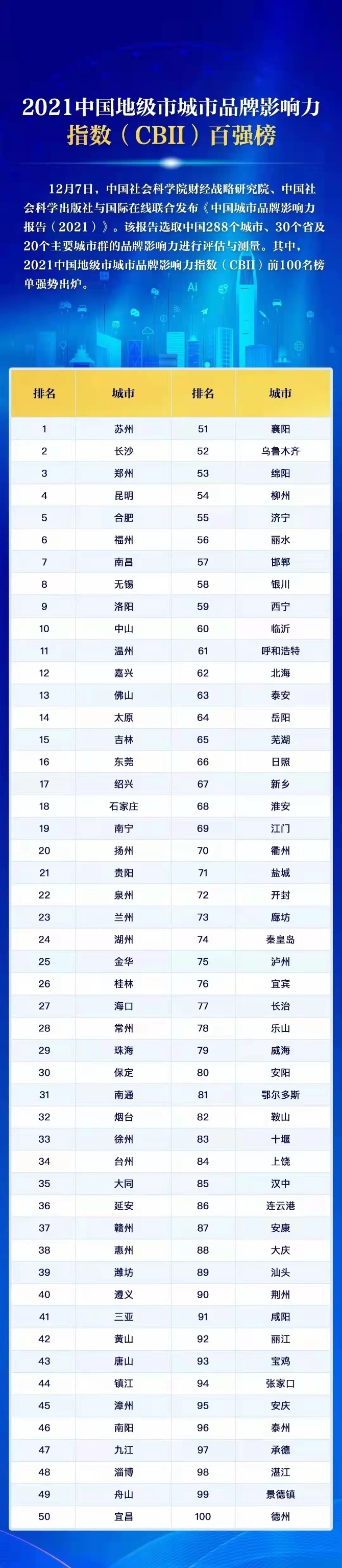 附2021中国地级市城市品牌影响力指数(CBII)前100名榜单: