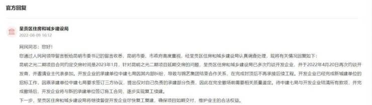 回复中说,承建单位中建七局已与锦艺集团结束合作关系,完成封顶后不再承接后续工程。现开发企业已经完成新承建单位的招标工作。待中建七局与开发企业结清所有款项,并完成撤场后,开发企业将与新的承建单位签订施工合同,逐步实现复工续建。