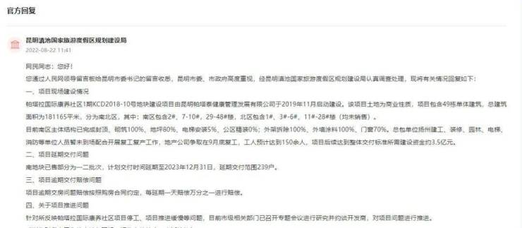8月22日,昆明滇池国家旅游度假区规划建设局回复了网友询问,并通报了该项目的现场建设情况。