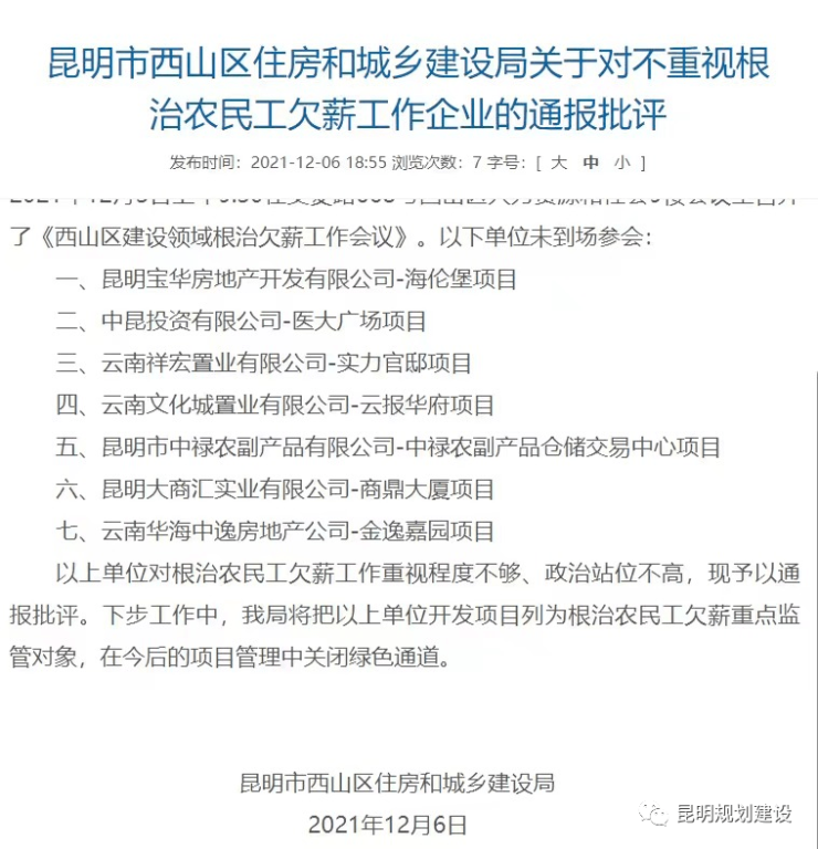 去年年底,西山区就有7家房企因拖欠农民工工资而被罚,且还被列为根治农民工欠薪重点监管对象,在今后的项目管理中关闭绿色通道。