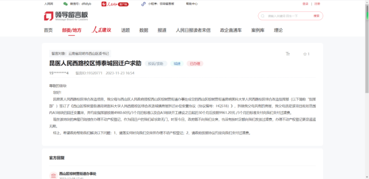 近日,有网友在人民网地方领导留言板投诉称:自家的房子在昆医人民西路校区综合改造项目中被拆,直到现在仍没有回迁,原本约定的过渡费也没发。对此,12月8日,西山区棕树营街道办事处作出了回复。