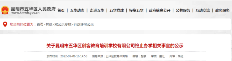 关于昆明市五华区创客教育培训学校有限公司终止办学相关事宜的公示