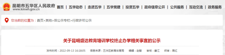 关于昆明盛达教育培训学校终止办学相关事宜的公示