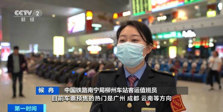 中国铁路南宁局柳州车站客运值班员 候冉:目前车票预售的热门是广州、成都、云南等方向。预计整个五一假期,柳州站将增加南宁、贺州等方向6趟车。