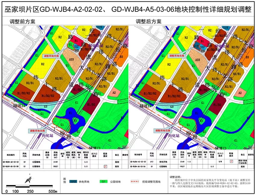 根据2019年第13次市规委会审议通过的《官渡区巫家坝片区太平寺变电站控制性详细规划调整方案》,将控规中位于中央公园的巫家坝太平寺变电站(地下站)调整至经一路与纬八支路交叉口G1地块,地块编号GD-WJB4-A2-02-02,面积5149平米。 原GD-WJB4-A2-02-02地块为公园绿地(G1),调整为供电用地(U12),容积率调整为1.0;GD-WJB4-A5-03-06地块为公园绿地(G1),规划控制指标保持不变。