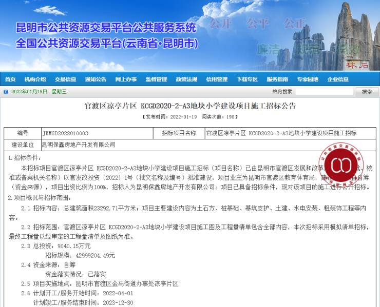 1月19日,昆明市公共资源交易平台发布《官渡区凉亭片区 KCGD2020-2-A3地块小学建设项目施工招标公告》,项目业主为昆明市官渡区教育体育局,建设资金来自自筹(资金来源),项目出资比例为100%,招标人为昆明保鑫房地产开发有限公司。
