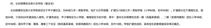 根据最新的学区划分方案,长圳保障性住房片区学校现状位于甲子塘社区,为84班九年一贯制学校,拟扩大办学规模,扩建为138班九年一贯制学校(小学84班,初中54班)。扩建部分位于塘尾社区,规划54班,计划2024年建成投入使用。扩建完成后,甲子塘校区为小学部,塘尾校区为初中部,其中:面向长圳保障性住房一期(凤凰英荟城)、二期(安居鸣鹿苑)招生小学48班、初中36班;面向甲子塘、塘尾、塘家三个社区(除凤凰英荟城、安居鸣鹿苑外)招生小学36班、初中18班。