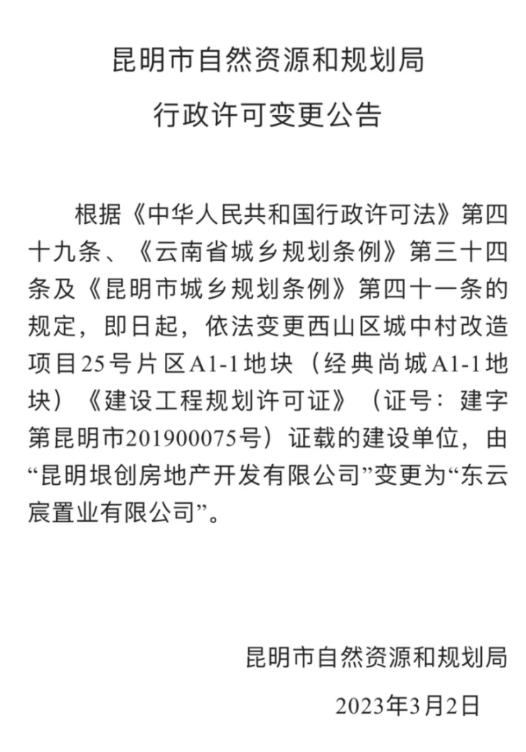 公告显示,经典尚城A1-1地块的建设单位,已由“昆明垠创房地产开发有限公司”变更为“东云宸置业有限公司”。