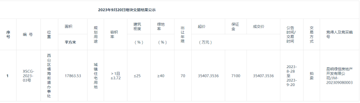 9月20日,西山区福海街道办事处成功出让约 26.79亩住宅用地,地块编号为XSCG-2023-03号,由昆明绿恒房地产开发有限公司以3.5亿元底价竞得,成交楼面价约5328元/㎡。