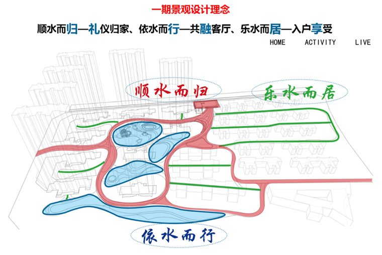 景观设计依据顺水而归——礼仪归家——共融客厅——乐水而居的理念,给业主打造一个舒适的小区环境。