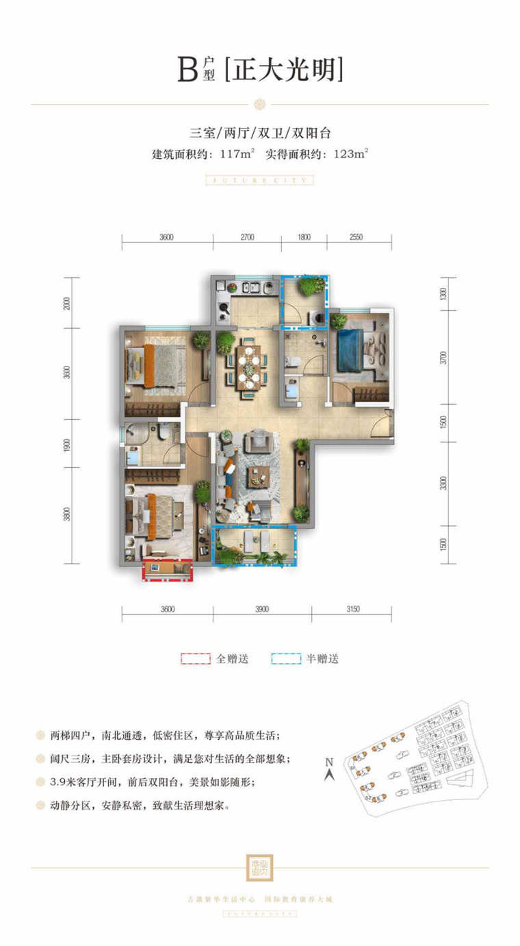 B户型:建面约117㎡,实得约123㎡,三室两厅双卫双阳台,2梯4户,3.9米宽景客厅,前后双阳台,打造舒适阳光生活;